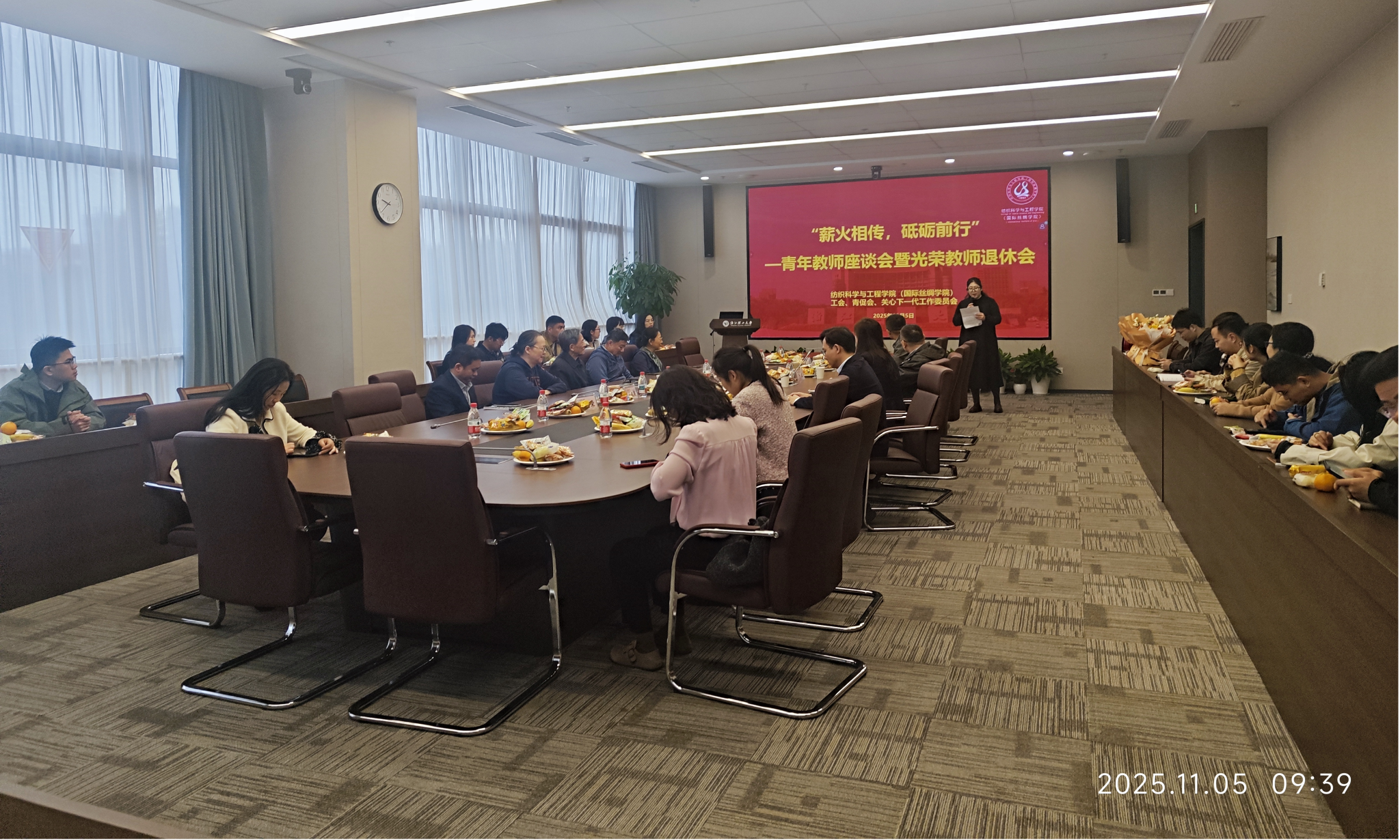 尊师重教的优良传统,致敬荣休教师的卓越贡献,激励青年教师扎根教坛、奋发有为,纺织学院(丝绸学院)于11月5日上午,在尚+大楼301会议室举办“薪火相传,砥砺前行”青年教师座谈会暨光荣教师退休会。资深教师代表李茂松、陈慰来、王银燕、杨斌、唐志荣出席会议,学院党委书记苏淼、院长于斌、副院长刘国金、学术副院长朱斐超、工会主席王金凤和青年教师代表30余人参加本次活动,致敬荣休岁月,传承师道初心,共绘发展蓝图。