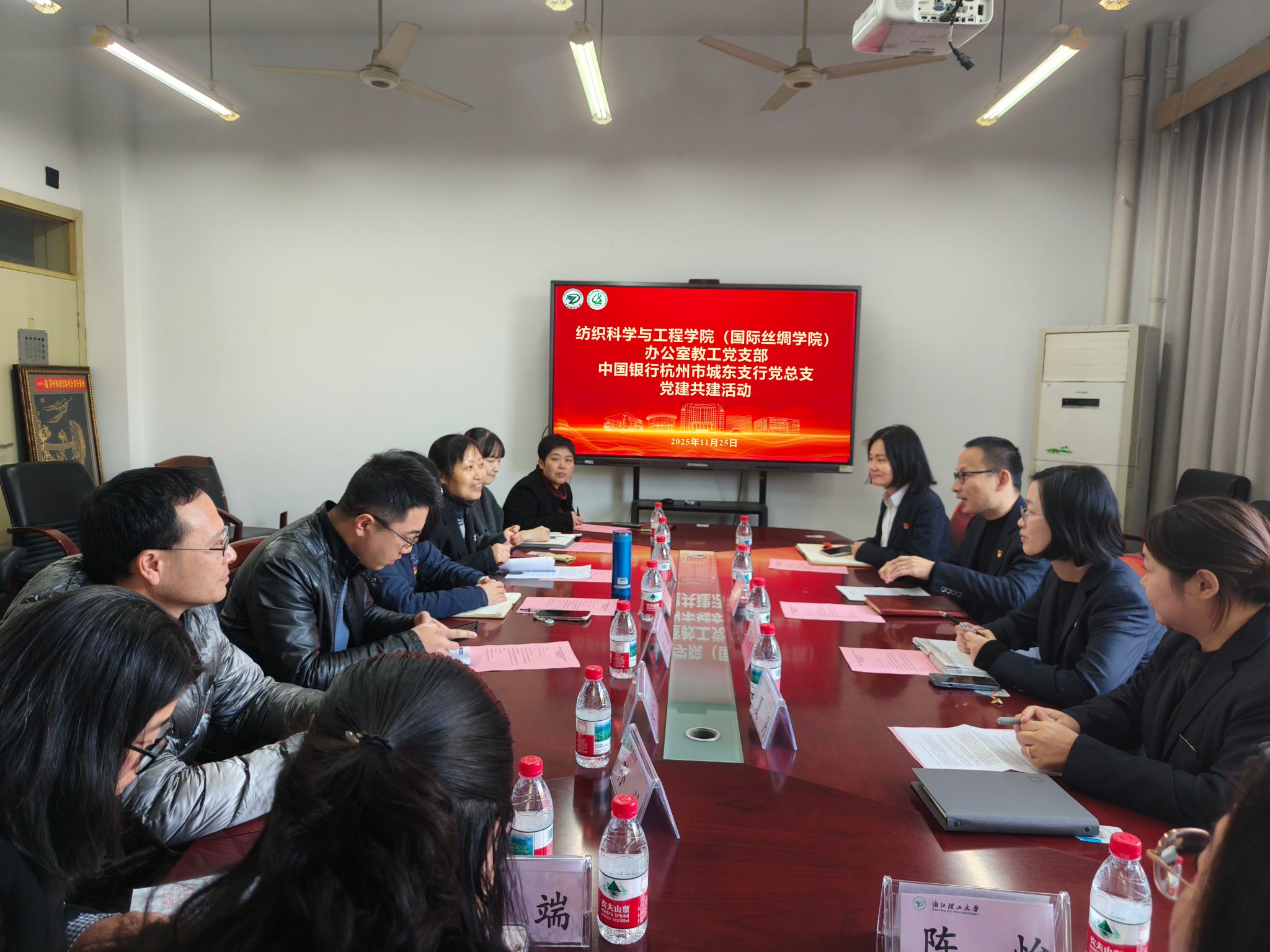 11月25日,纺织学院(丝绸学院)办公室教工党支部与中国银行杭州市城东支行党总支联合开展了党建共建活动。中国银行杭州市分行纪委派驻城东、钱江新城纪检组组长阮隽,城东支行营业部副主任陈芳芳等一行4人;纺织学院(丝绸学院)党委副书记、纪委书记张孝凤,教学科研办公室主任顾越桦等9位支部老师共同参加了此次活动。