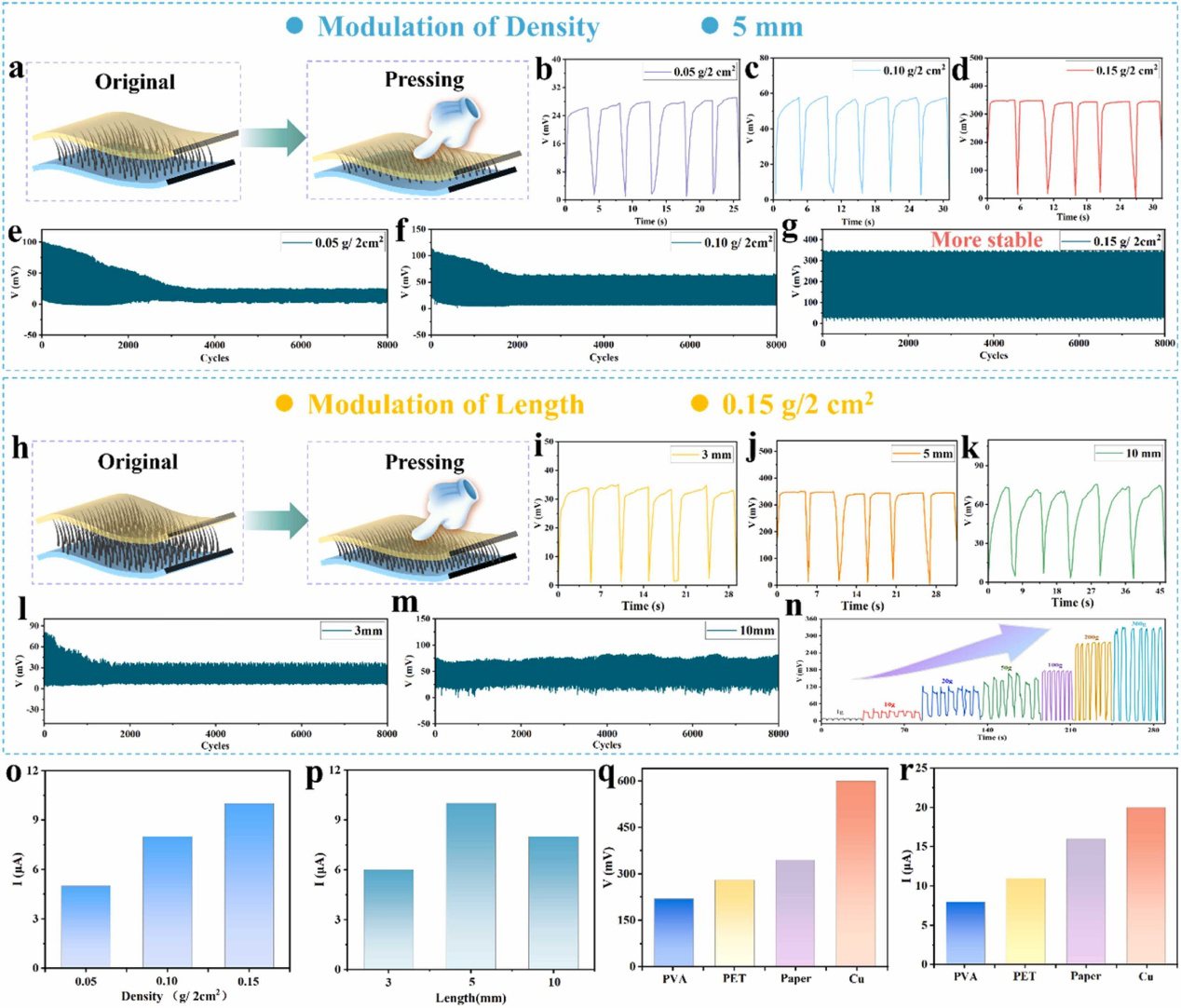 图6. 探究不同密度和长度的棉纱制备的PCR-TENG的输出性能。